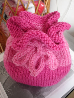 Com esse calor e com fio no pescoço só consegui tricotar esse saquinho para sabonete e que também serve para tomar banho. Esse eu fiz para menino e nas agulhas está um para menina no ponto arroz. Ele é costurado embaixo e as pontas do cordão também são costuradas. A receita é do livro One-Skein Wonders que você pode comprar pelo site www.amazon.com . Usei dois fios juntos Bella Color/Pingouin com agulhas de duas pontas nº 4.