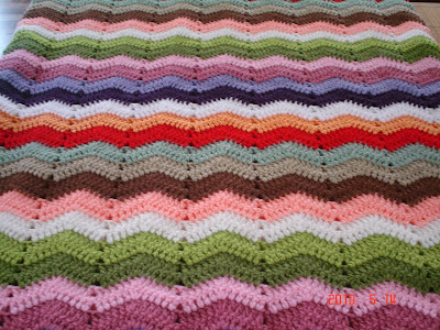 É fácil e delicioso de fazer. É viciante, contagiante, maravilhoso, alegre, alto astral e não dá mais vontade de parar. Agora, fico assim: com um trabalho de tricot, com um trabalho de crochet e com um livro pra ler. Faço um revezamento entre os três sem contar com o (chato mas necessário) serviço doméstico. Uma loucura! E, também com filme pra ver que antes eu só via legendado e agora só dublado pra poder tricotar ou crochetar enquanto assisto (ouço) o filme, 'sabecumé'? Essa manta do meio é nova, (a receita é do livro 200 Ripple Stitch Patterns by Jan Eaton) um pouquinho diferente das outras duas, pois essa tem uns furinhos! E viva o crochet! E viva o ripple!!!!