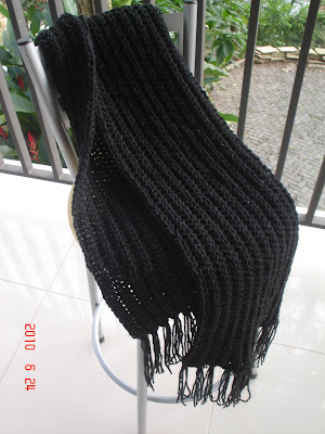 Até que enfim, terminei o bendito!!! Fio Flash - Pingouin - 100g cada. 02 novelos inteirinhos, contando com as franjas. Agulha nº 7 mm. Ponto Ventania. 45 pontos (sim, depois do post anterior eu ainda desmanchei mais uma vez e diminuí a quantidade de pontos). Comprimento: 1,70 m e largura 34 cm (achei melhor do que 40 cm). Ficou macio e com um bom caimento. Mas, vou te contar, heim?! Quanto sofrimento por um trabalho tão simples! Por isso, eu não gosto de aceitar encomendas... só que esse eu não podia recusar de jeito nenhum! Ok. No final, um final feliz! Gostei do resultado e acreditem, estou pensando em fazer outro na cor vinho do mesmo fio. Vou aproveitar todos os fios que tenho empacado aqui em casa pra fazer um monte de cachecóis simples pra vender a um preço bem barato, tipo liquidação! Aliás, estou terminando um par de meias, encomenda de uma amiga. Se eu sumir de novo já sabe, vou estar trabalhando (olha o gerúndio de telemarketing - risos). Beijão!!!!